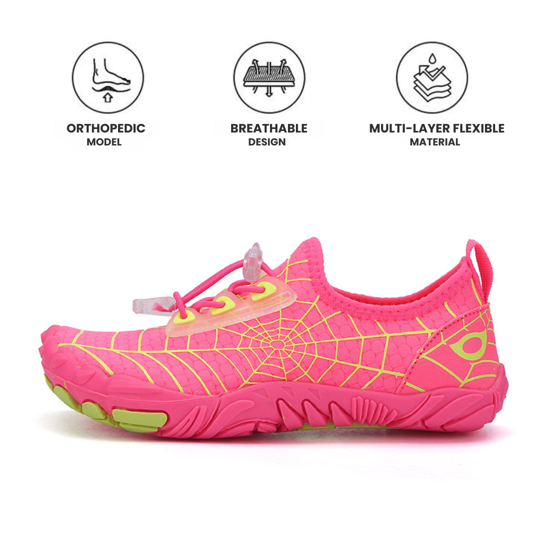 According to medical professionals, barefoot walking is the most natural and healthiest way of walking for kids' feet. With tight, padded shoes, children's feet cannot grow and develop properly. The Explorer Pro supports natural foot development and promotes a healthy posture by allowing natural movement and strengthening muscles.
