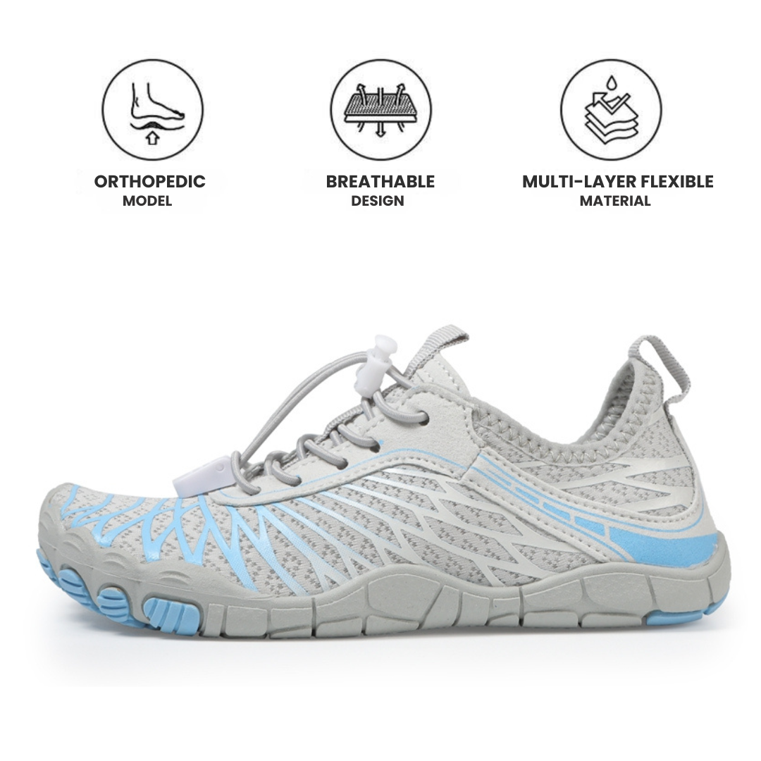 Barefoot shoes like the FootEase Pro Kids help children develop strong foot muscles and balanced equilibrium. The wide toe box allows the little toes to move freely, contributing to healthy foot development.